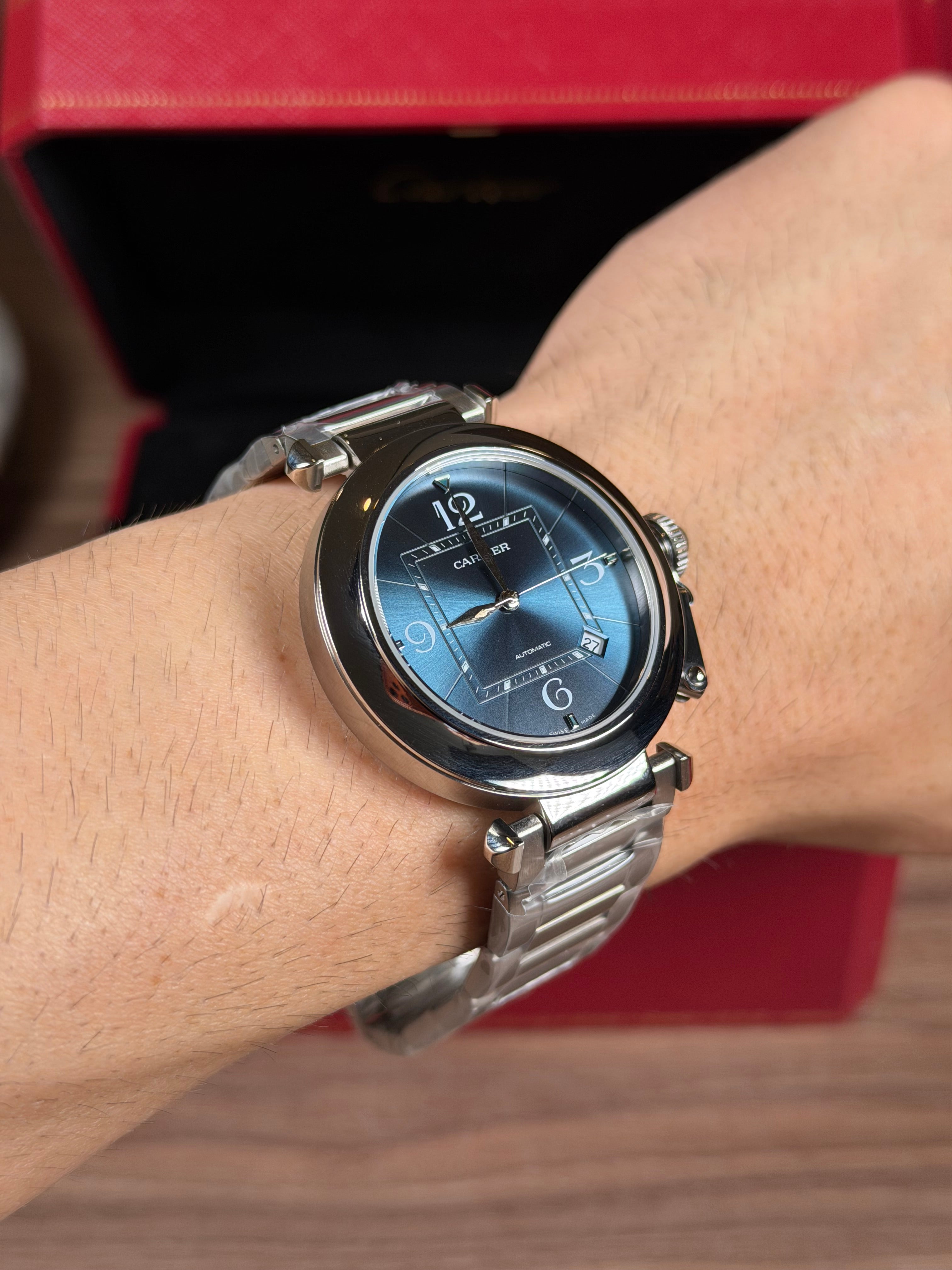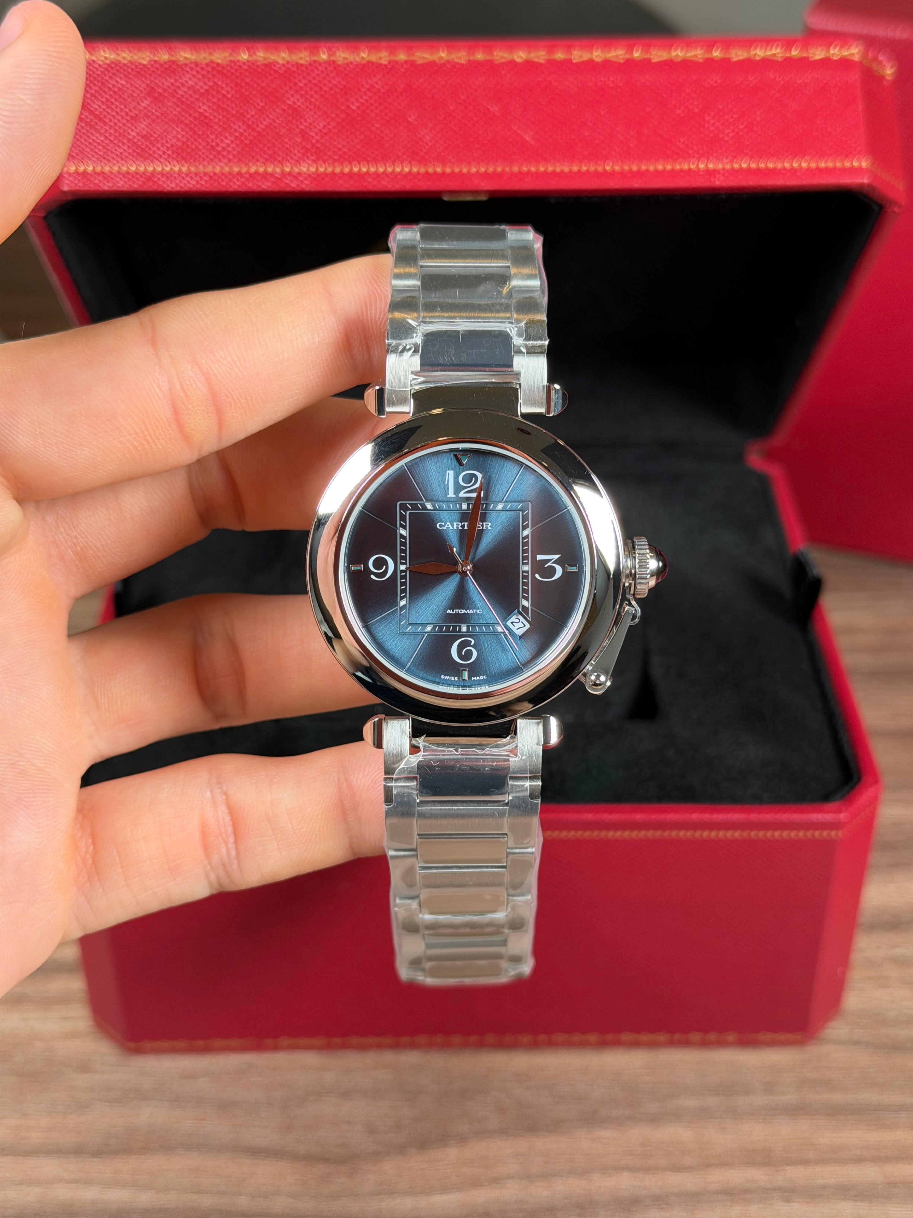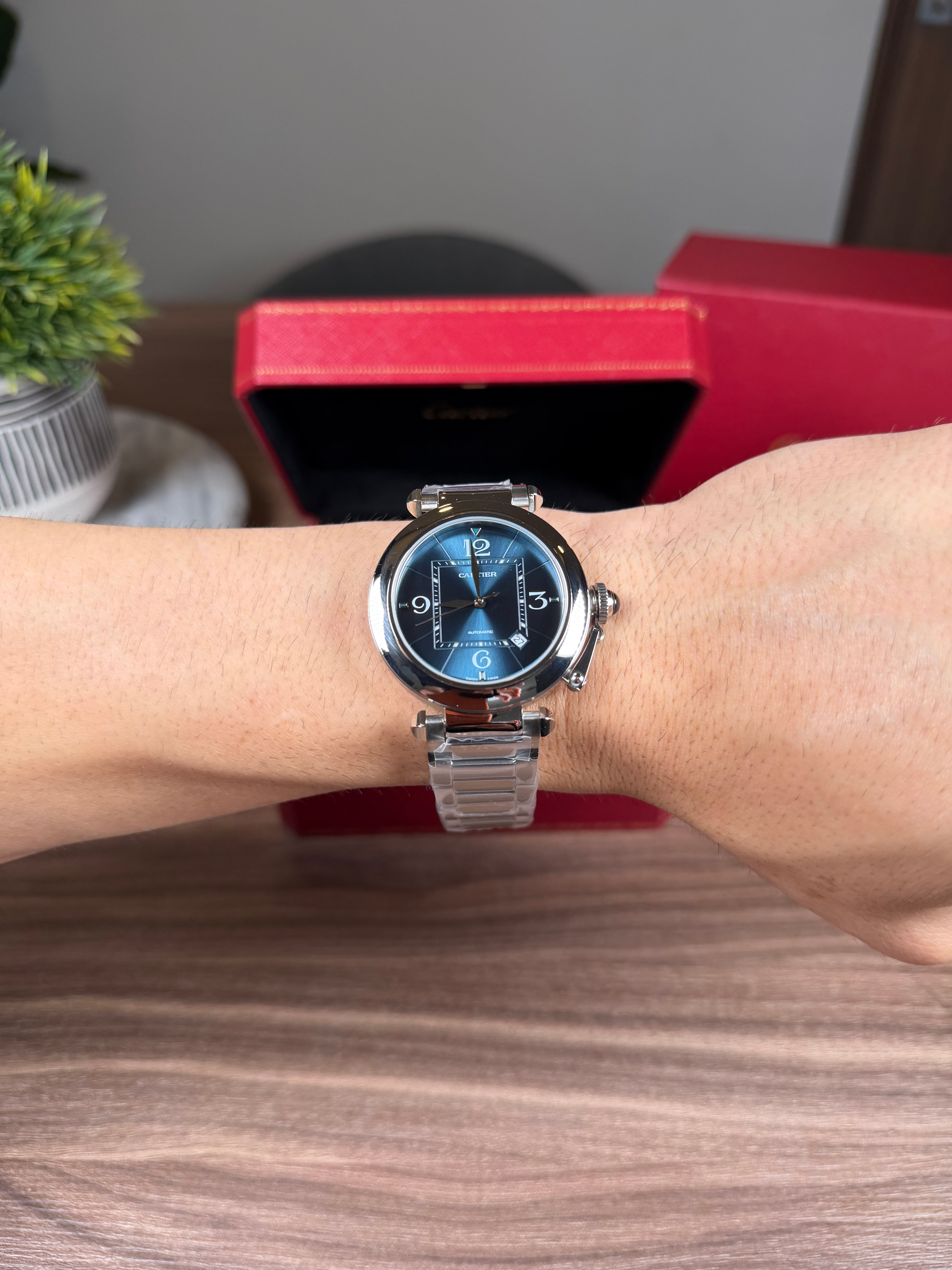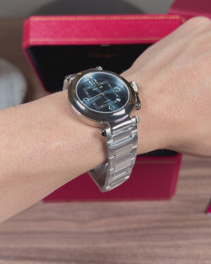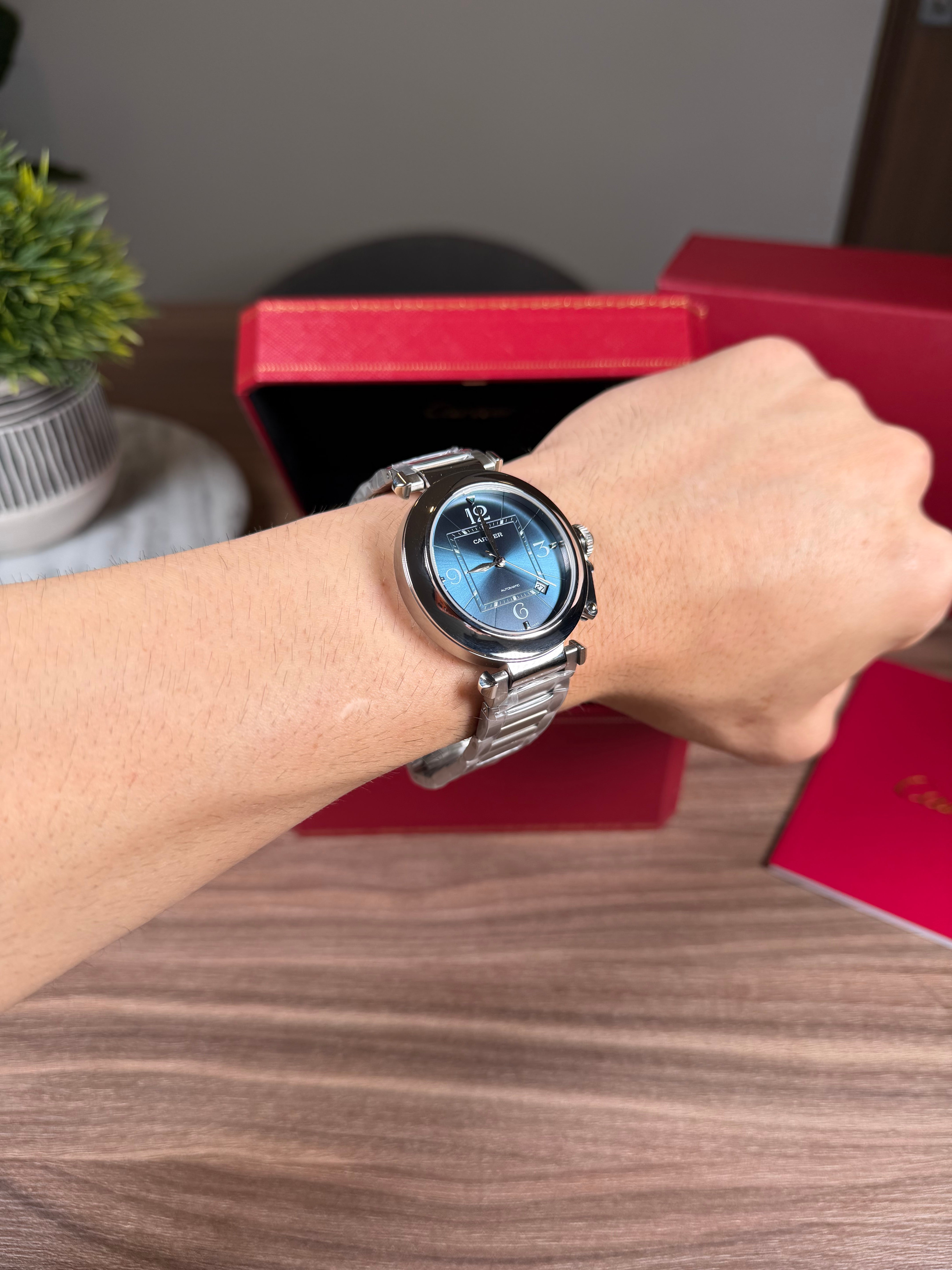 CARTIER PASHA PLATEADO FONDO AZUL