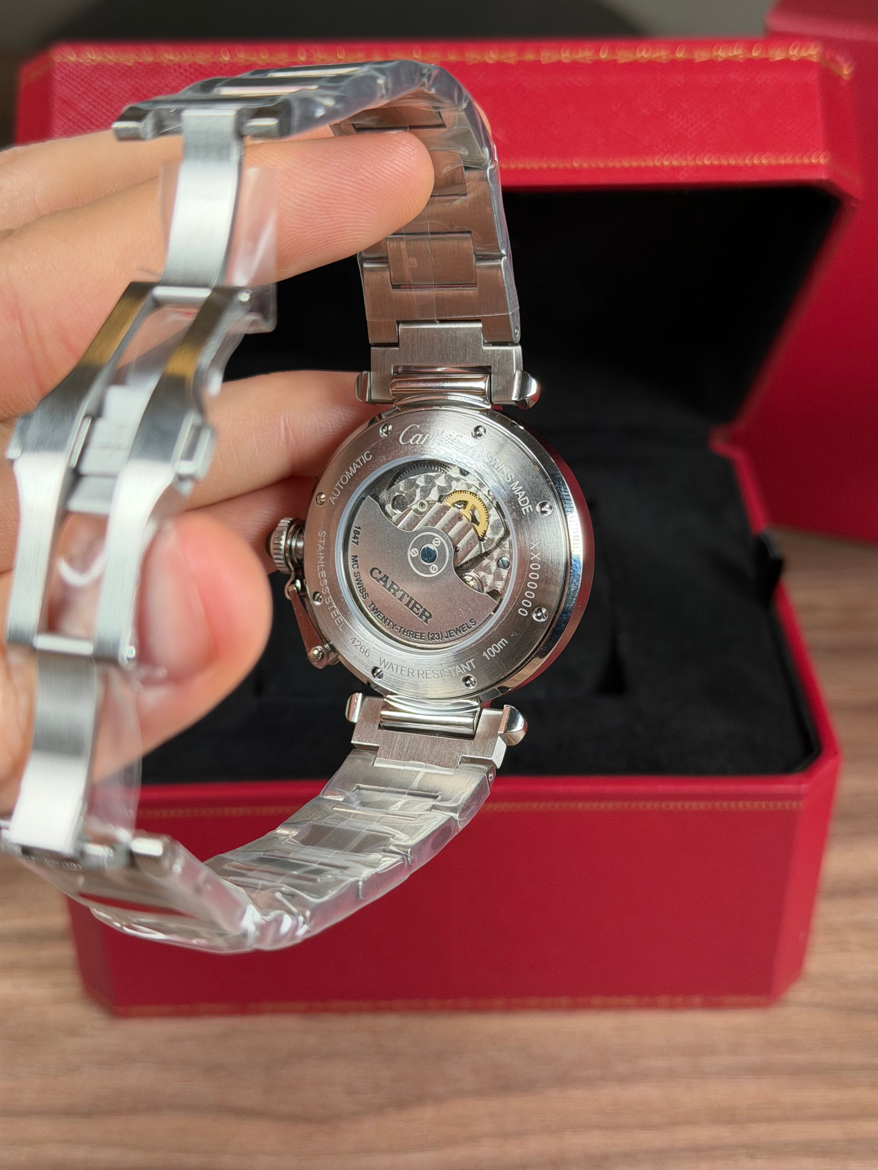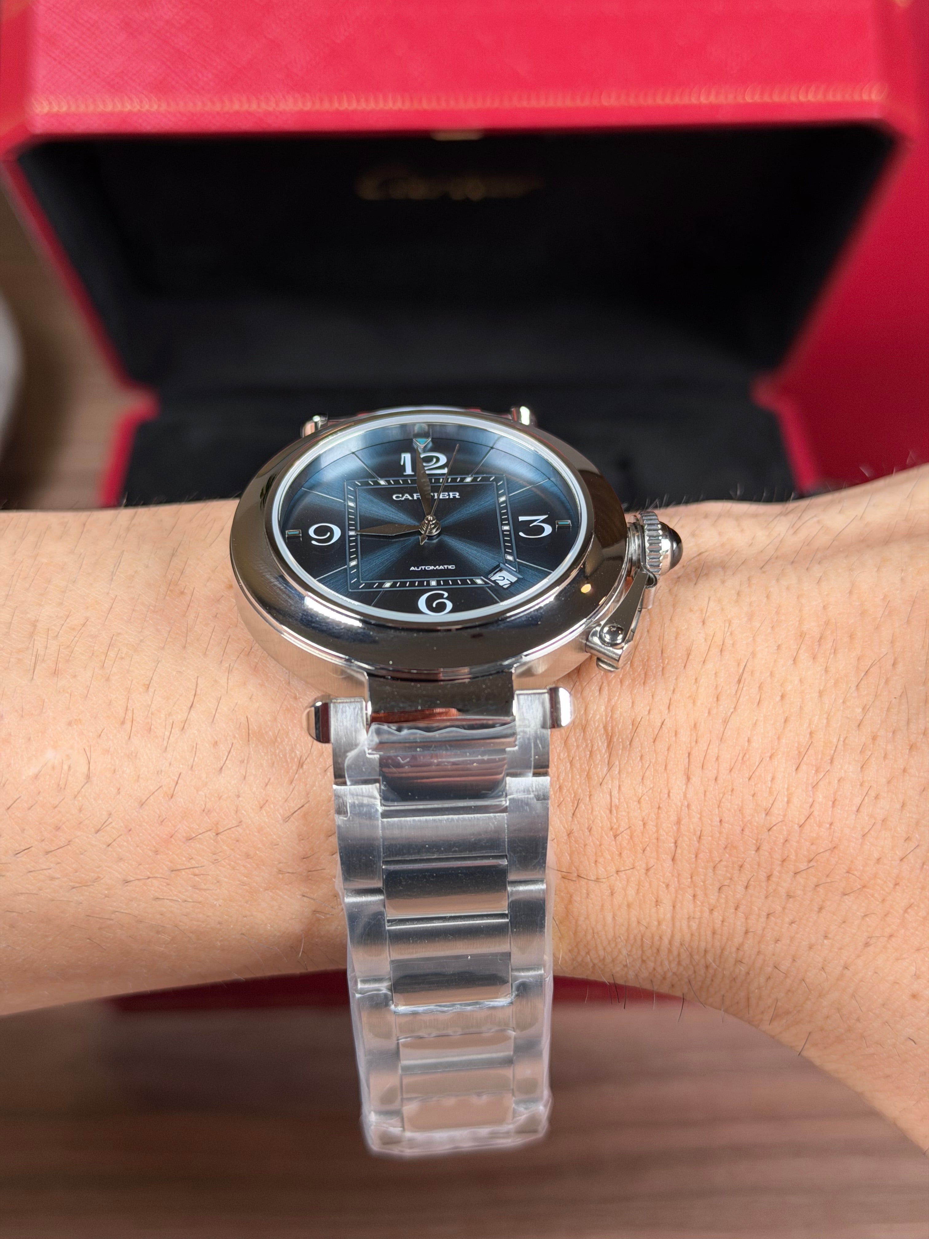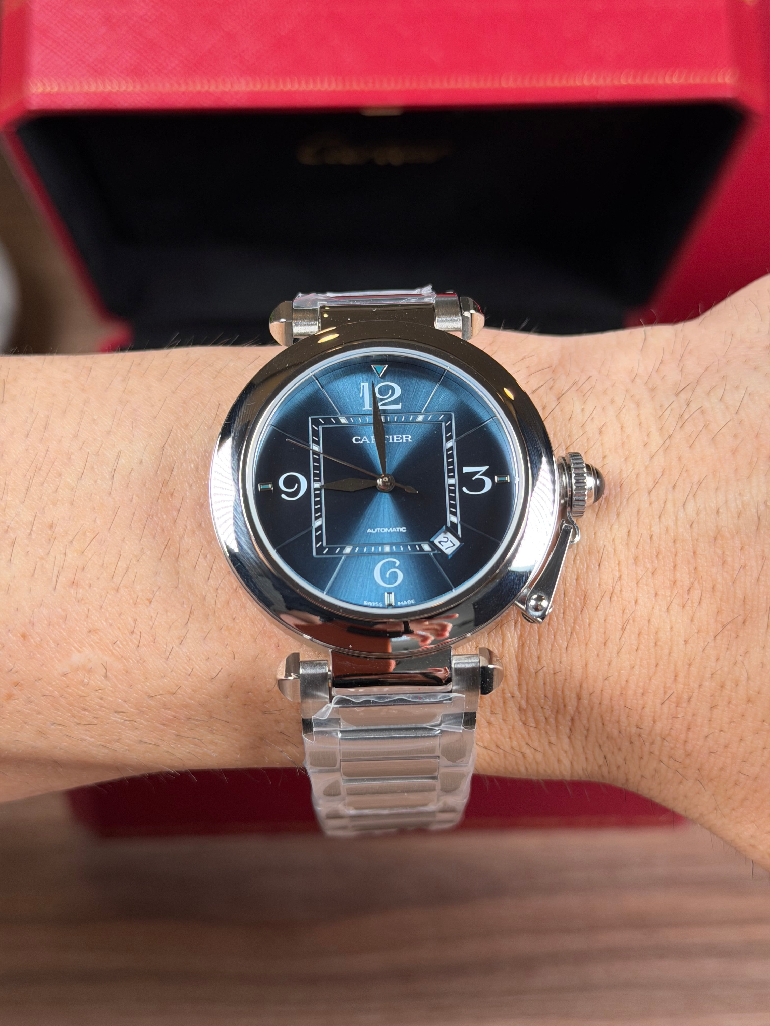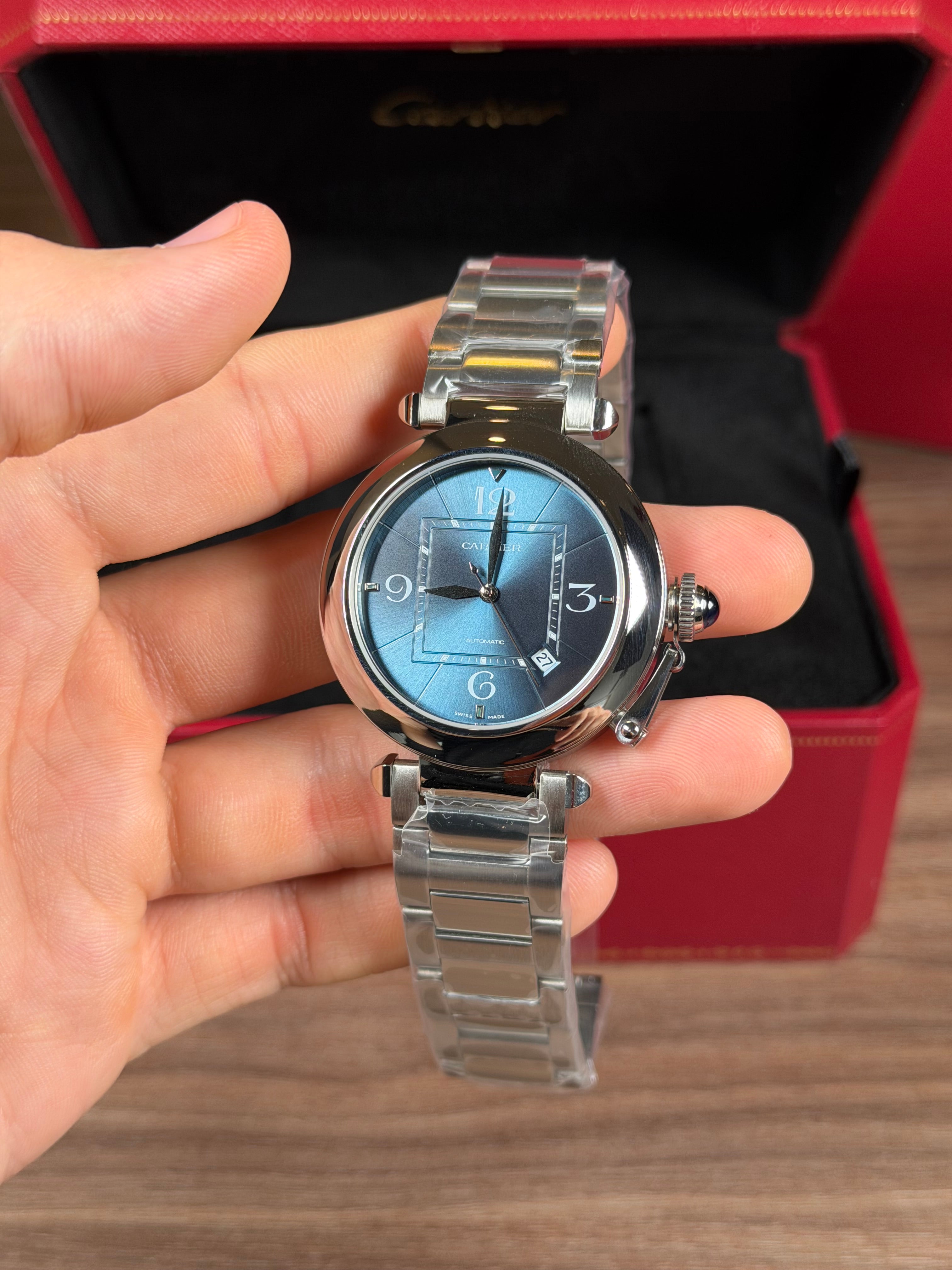 CARTIER PASHA PLATEADO FONDO AZUL