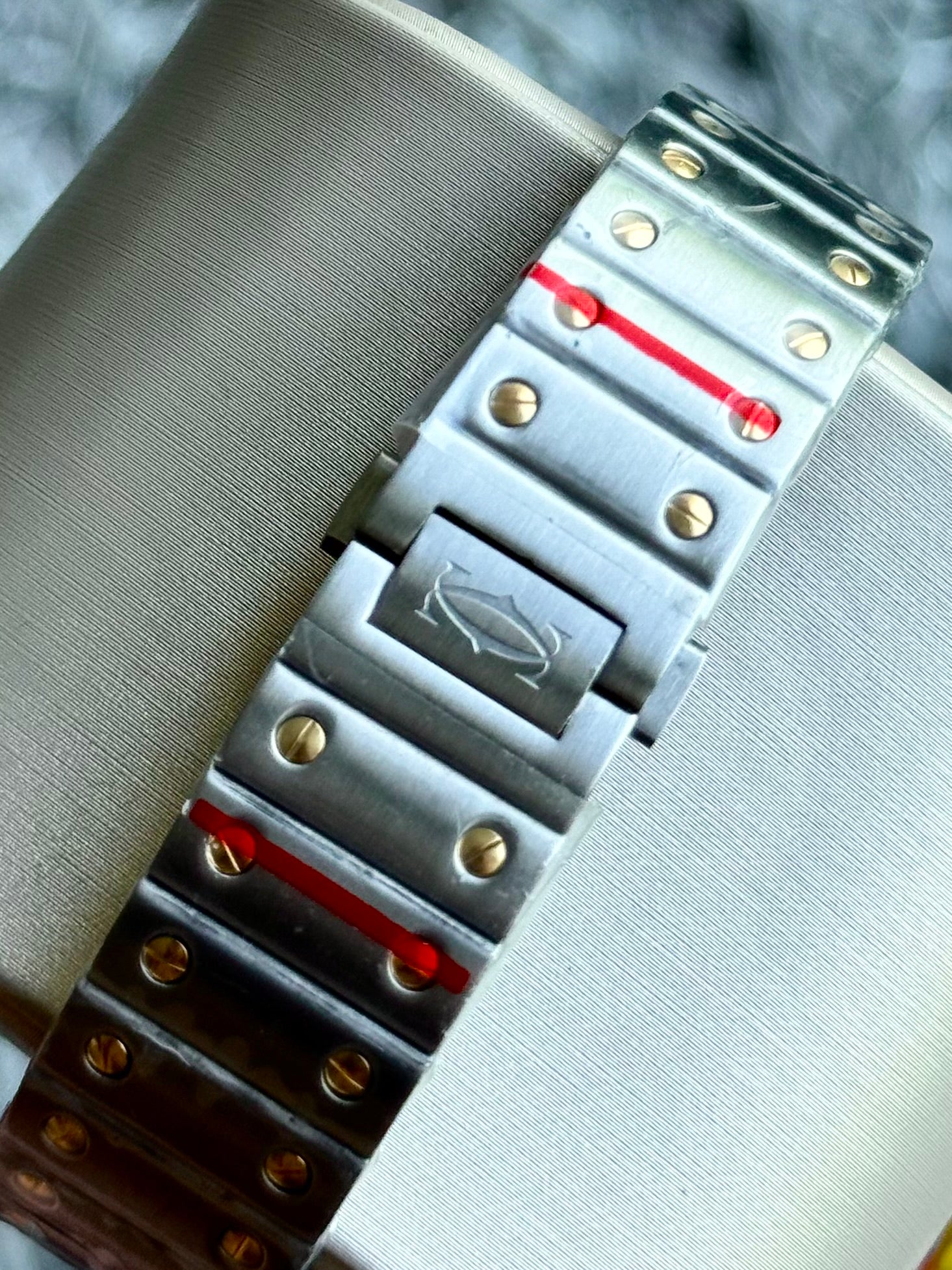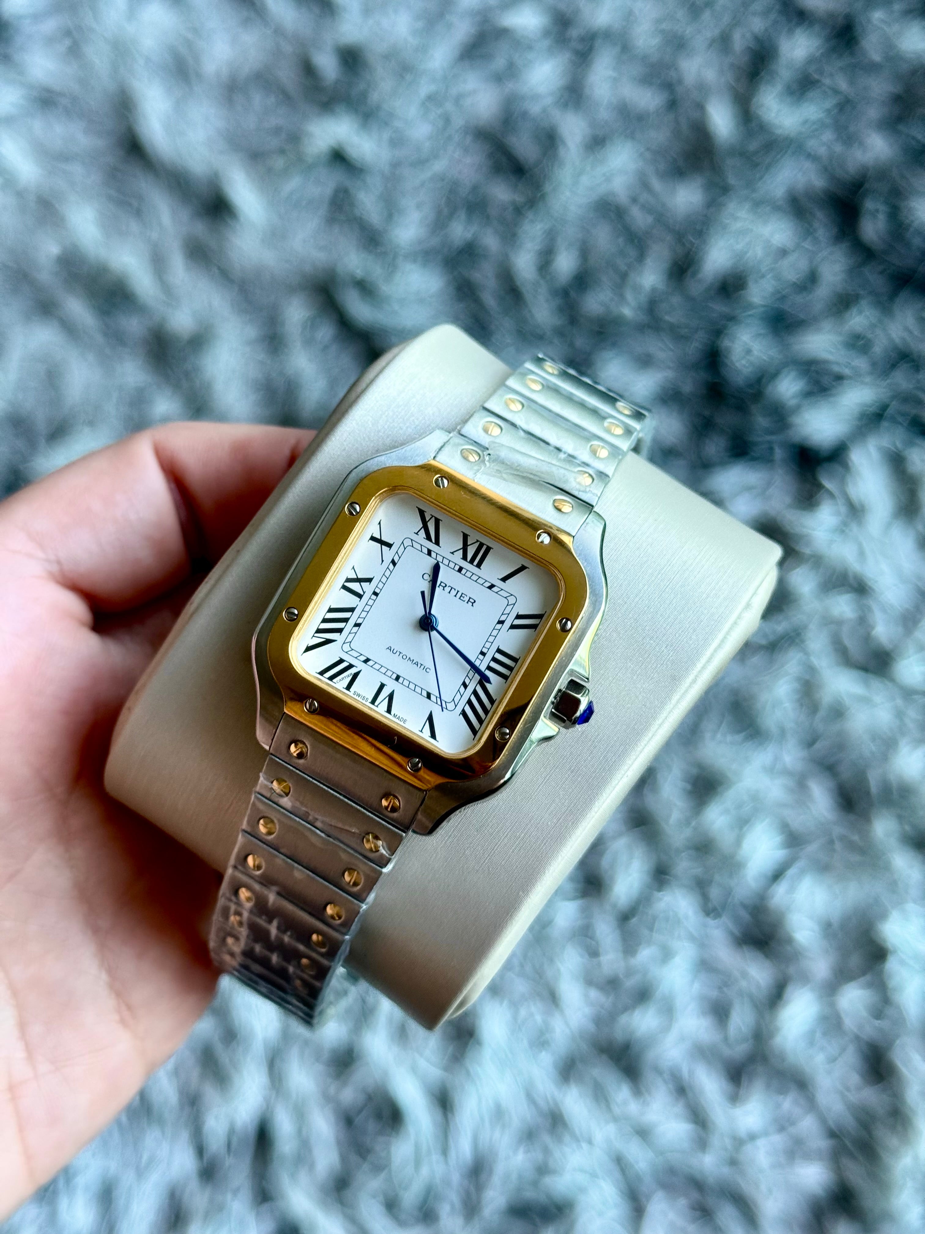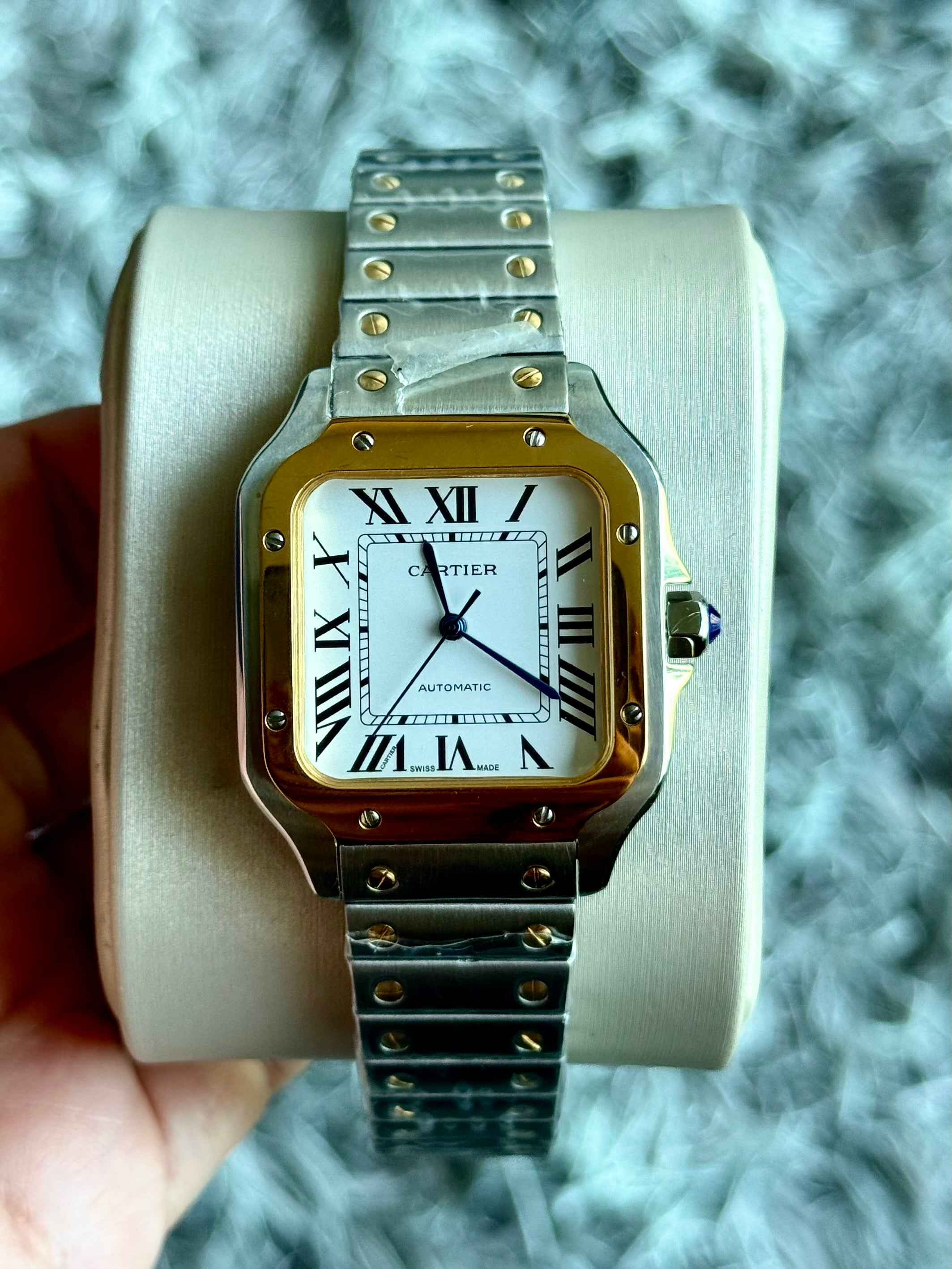 El Cartier Santos de 36 mm en acero y acero dorado es una joya clásica que combina lujo y discreción, ideal para quienes prefieren un reloj de caja más pequeña. Con su emblemática caja cuadrada y la elegante mezcla de acero inoxidable con detalles en oro amarillo, este modelo es un homenaje a la tradición de Cartier, diseñado originalmente en 1904 para el aviador Alberto Santos-Dumont. Su tamaño lo hace perfecto tanto para mujeres como para hombres que buscan un reloj refinado y versátil, adecuado para cualquier ocasión. Con su diseño de doble tono, es una pieza atemporal que une historia, sofisticación y estilo moderno. Características Generales: