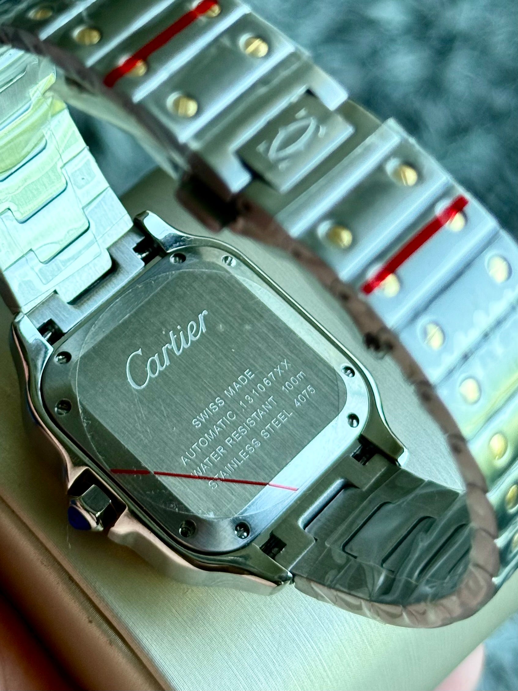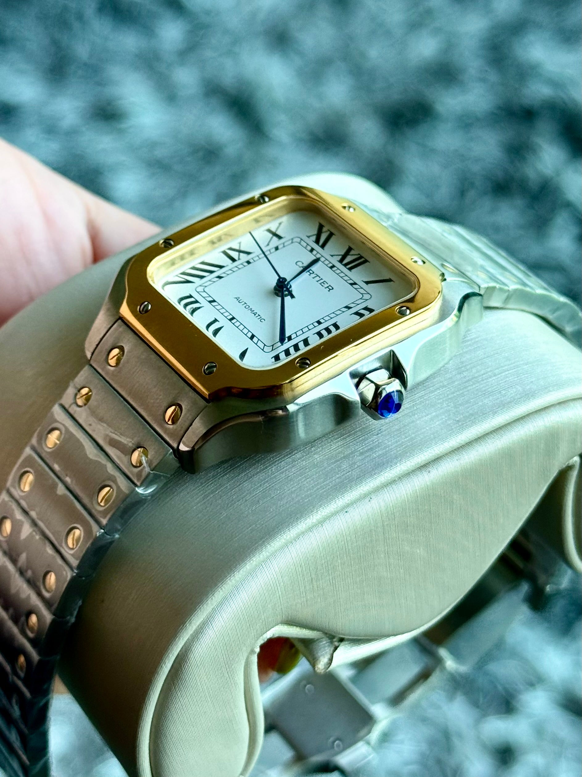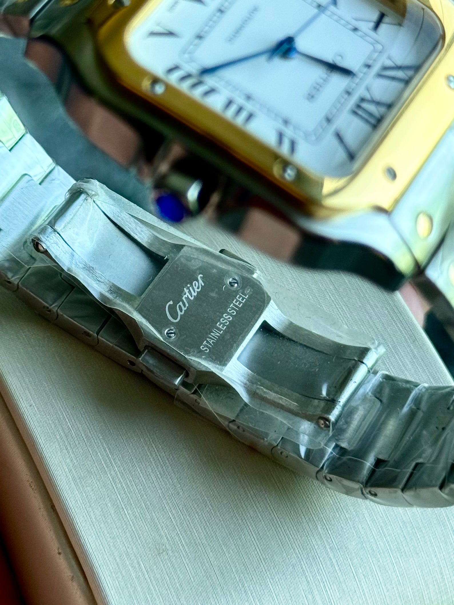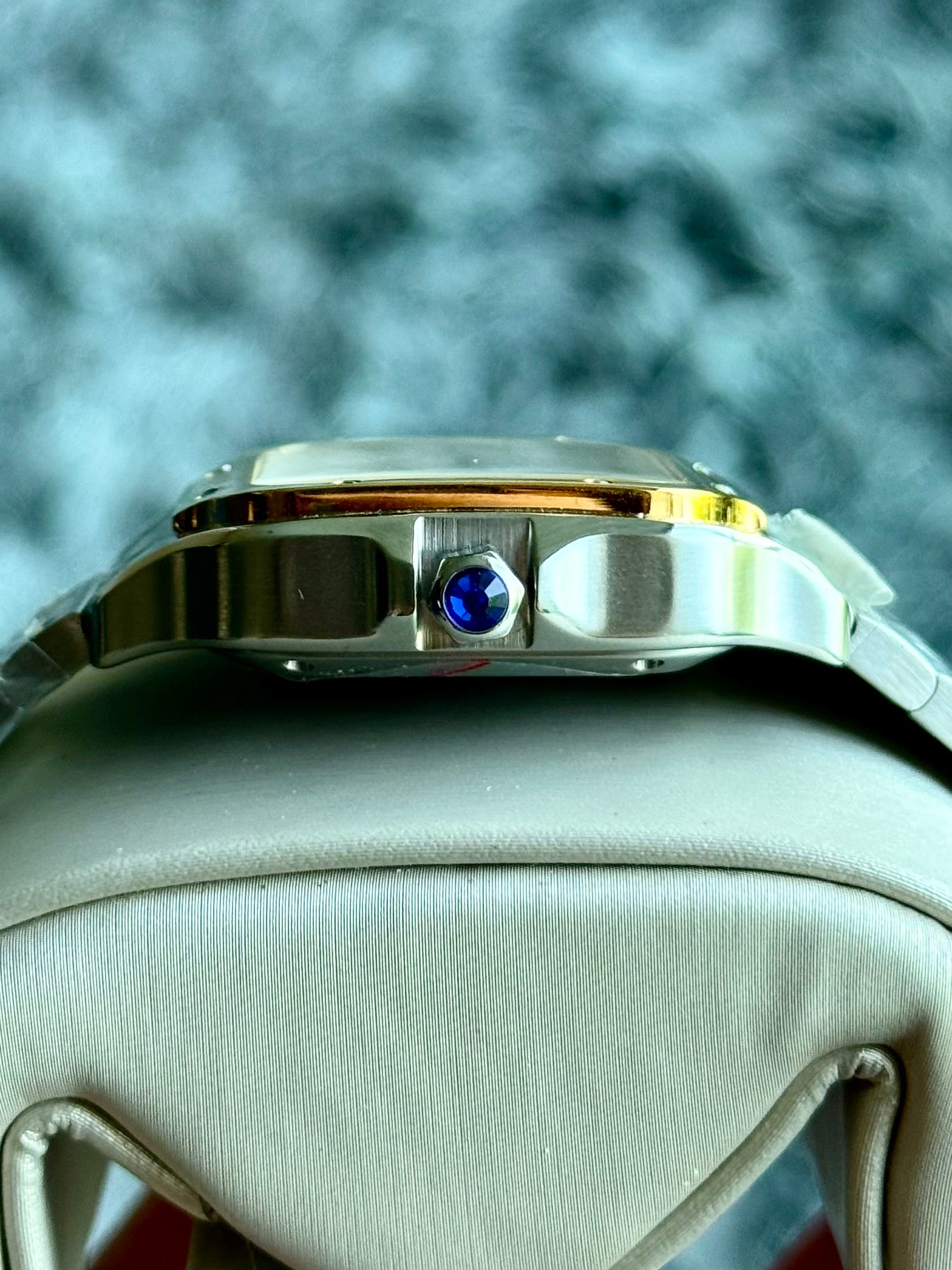 Modelo: Réplica CARTIER SANTOS DOBLE TONO 36mm material: Acero Inoxidable Diámetro de la caja: 36 mm Bisel: cuadrado Esfera: acero, espadas azules en manecillas Cristal: Zafiro resistente a los golpes y ralladuras