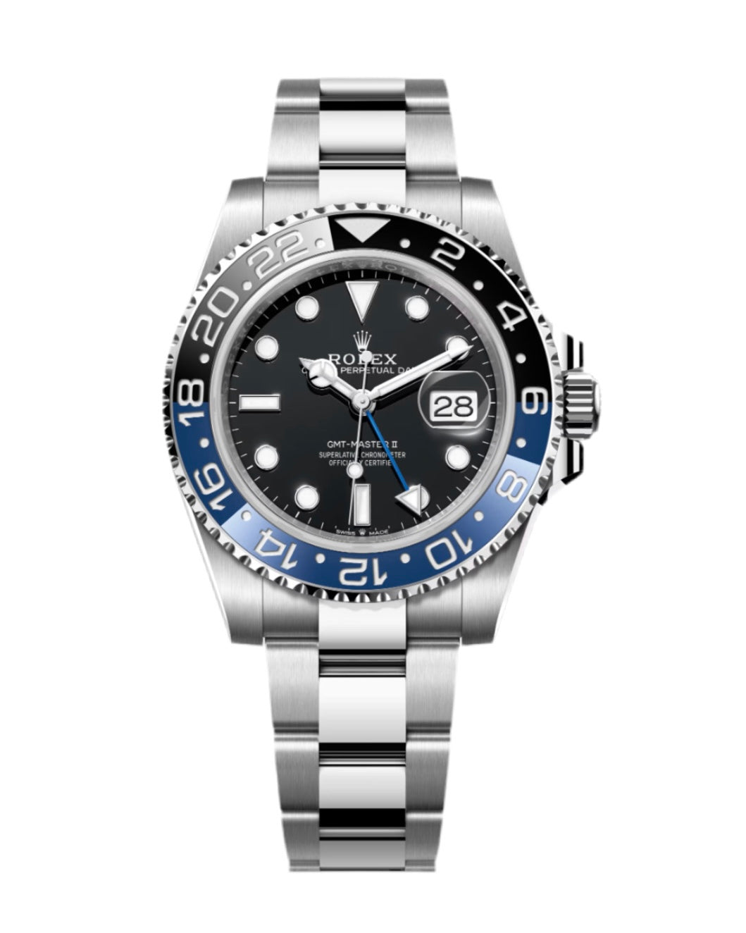 El Rolex GMT-Master II Batman debe su apodo al icónico bisel bicolor en azul y negro, evocando los colores del legendario superhéroe. Lanzado en 2013, este reloj revolucionó el diseño de Rolex al ser el primero en utilizar un bisel cerámico de dos tonos, simbolizando la dualidad del día y la noche. Originalmente diseñado para pilotos, su función GMT permite leer múltiples zonas horarias, convirtiéndolo en un imprescindible para viajeros y coleccionistas. Con su estilo imponente y tecnología avanzada, el GMT Batman no solo es un homenaje a la innovación, sino también a la aventura global. Características Generales: