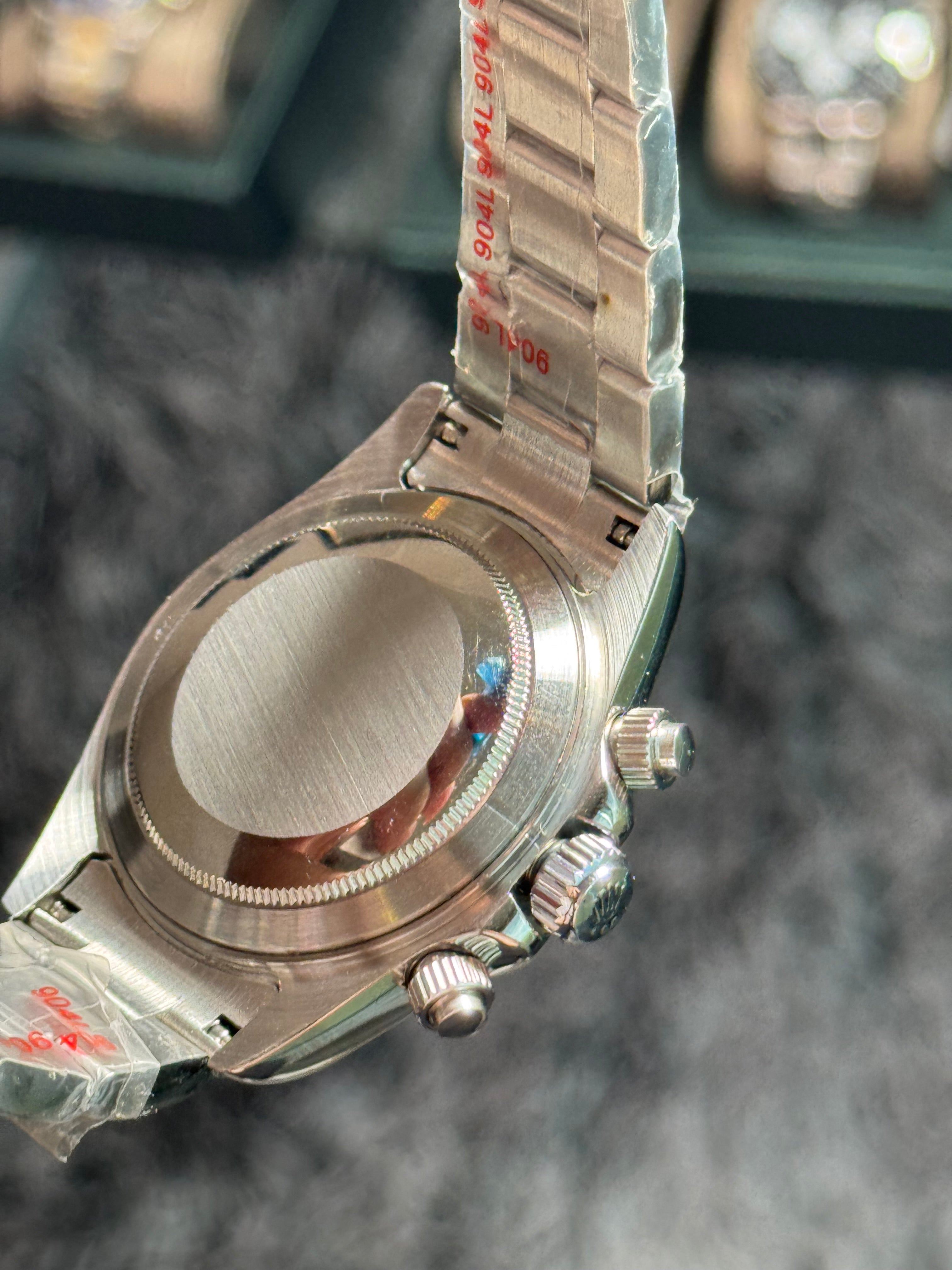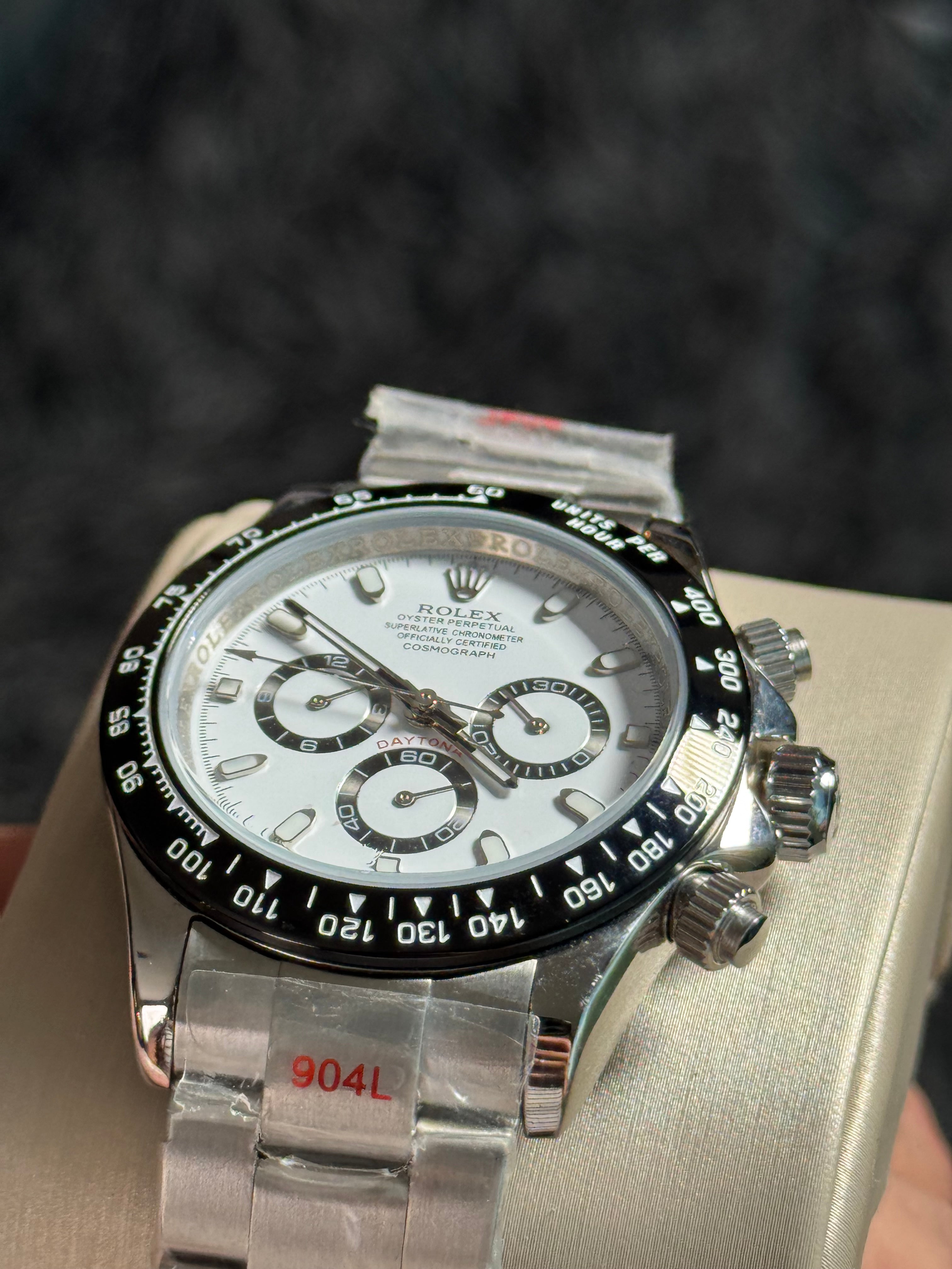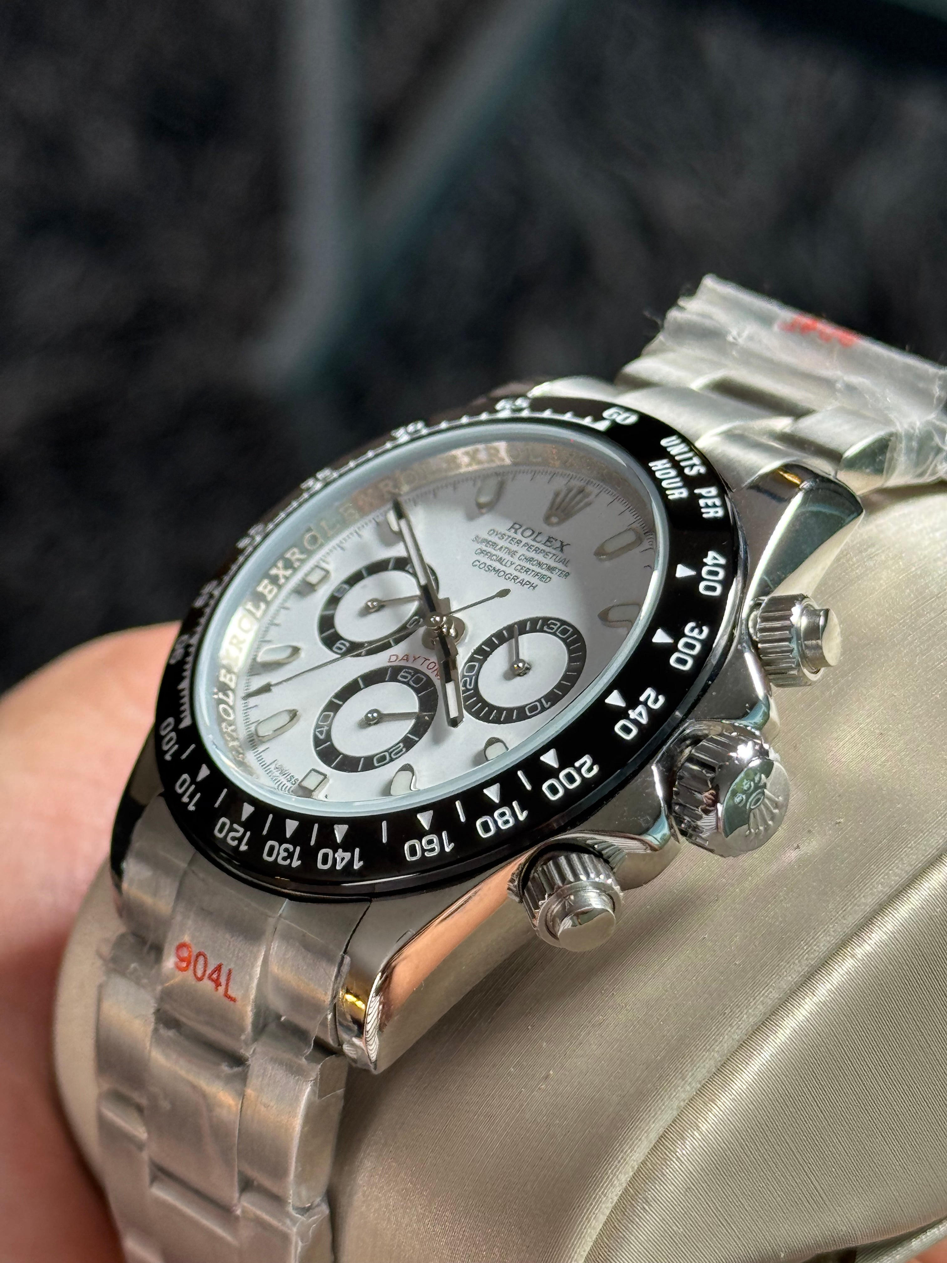 Modelo: Réplica Rolex Daytona "Panda" 40mm material: Acero Inoxidable Diámetro de la caja: 40 mm Bisel: ceramica negra Esfera: negra con manecillas luminiscente Cristal: Zafiro resistente a los golpes y ralladuras con lente Cyclops sobre la fecha