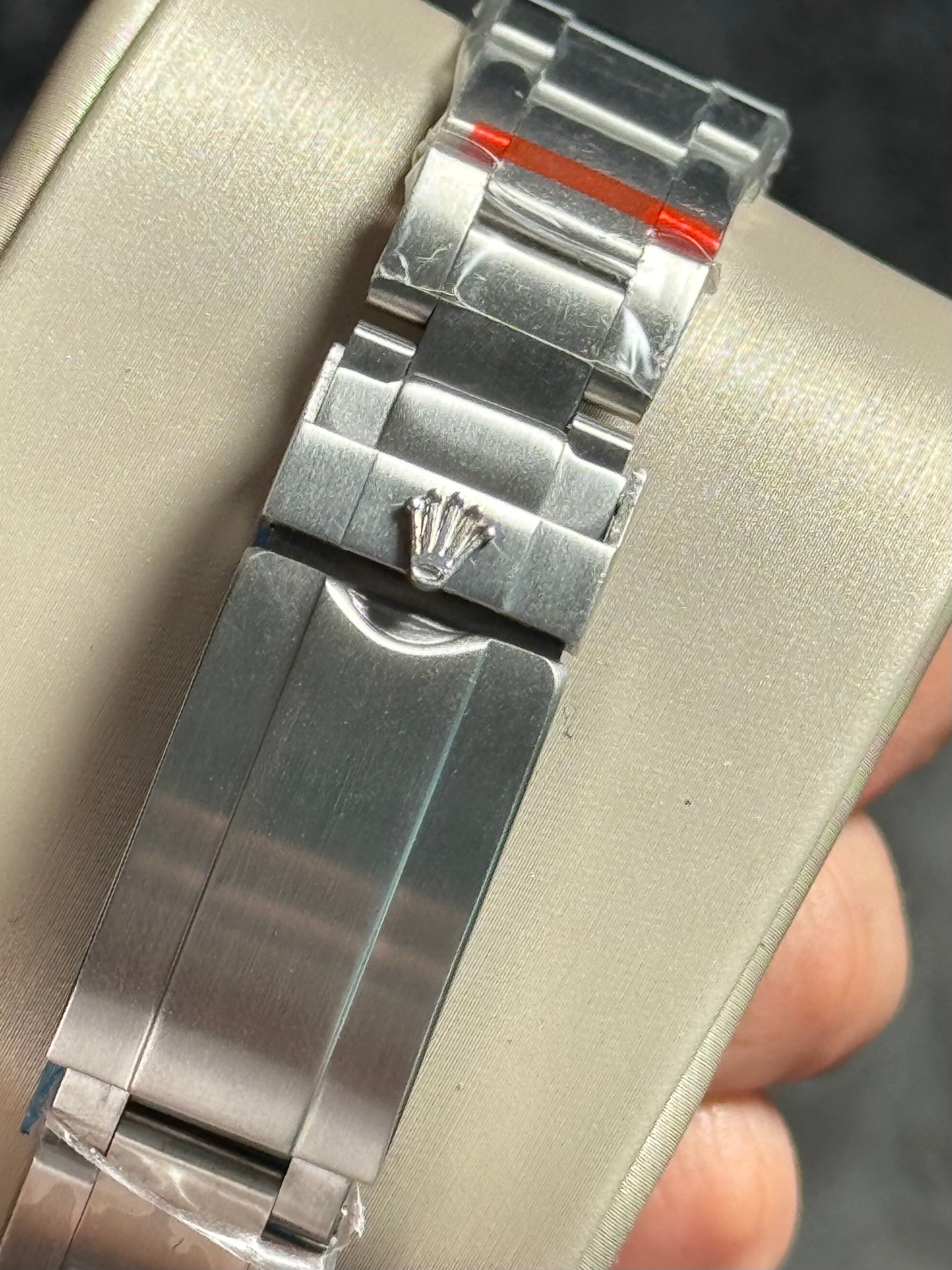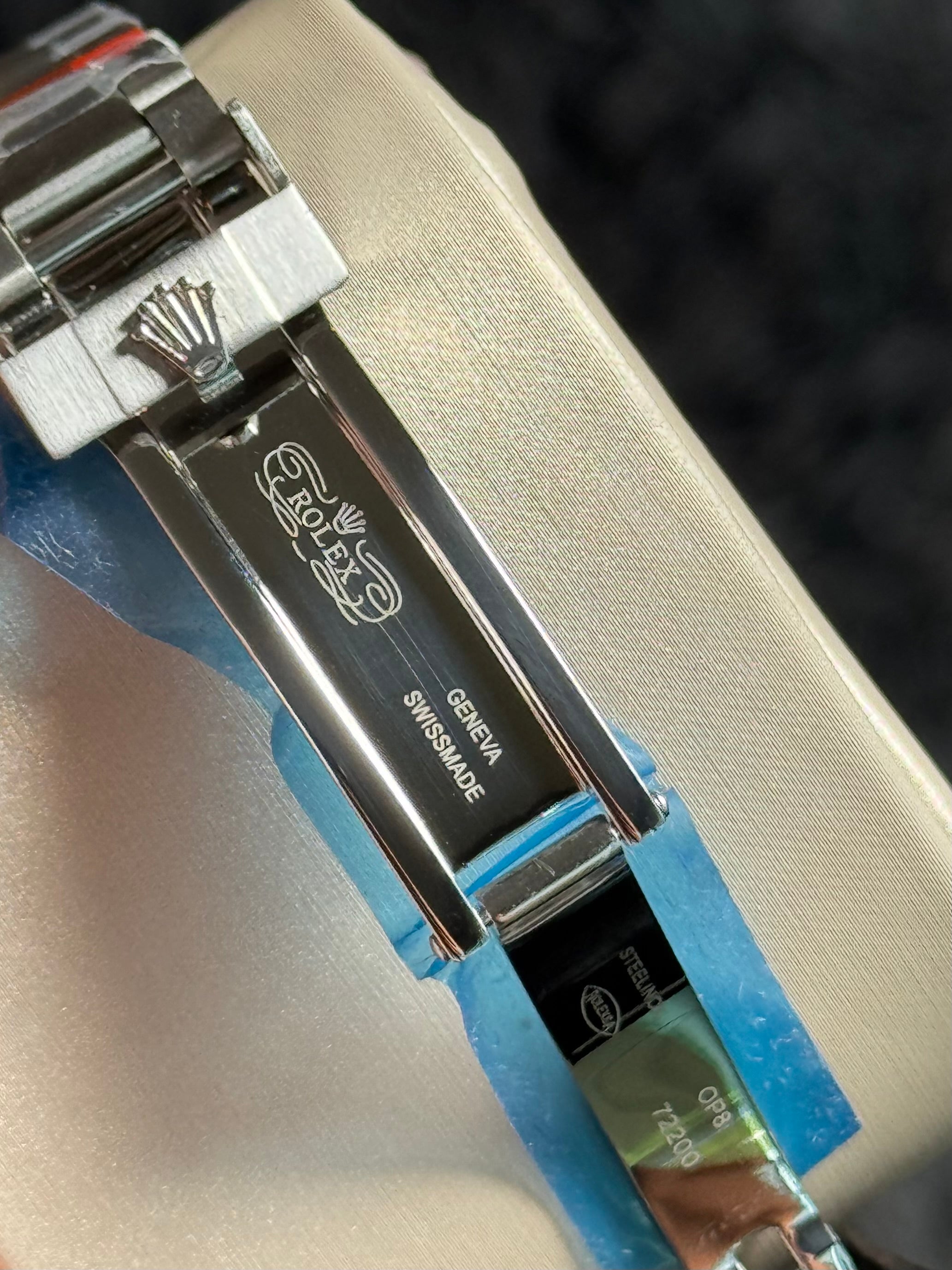 Correa: Pulsera OYSTER en tono plata. Broche: Cierre desplegable Oysterlock con logotipo de la corona de Rolex Contramarcados: