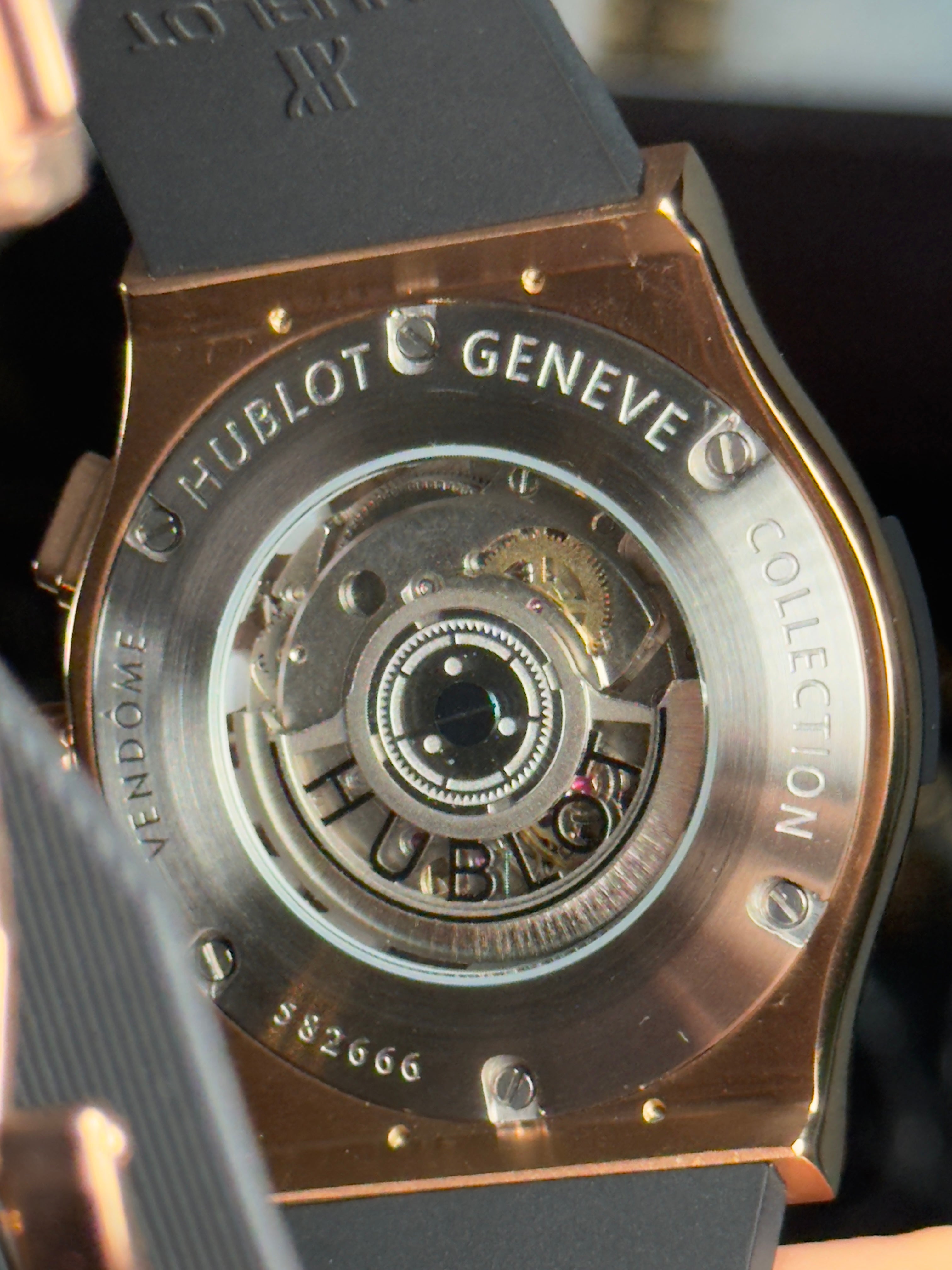 Hublot Geneve, un modelo automático con cronógrafo y caja de oro rosa y esfera negra.